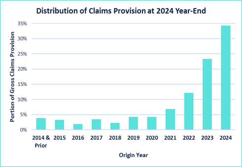 Only one-third of reserves relate to 2024 claims; 4% relate to claims more than ten years old. This maturity profile is a significant driver of reserve risk within the SCR, contributing to the conservative capital buffers many captives maintain.