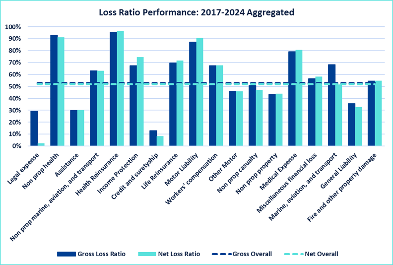 Irish captives have delivered consistently profitable underwriting results. From 2017 to 2024, the sector recorded an average 53% gross and 52% net loss ratio.